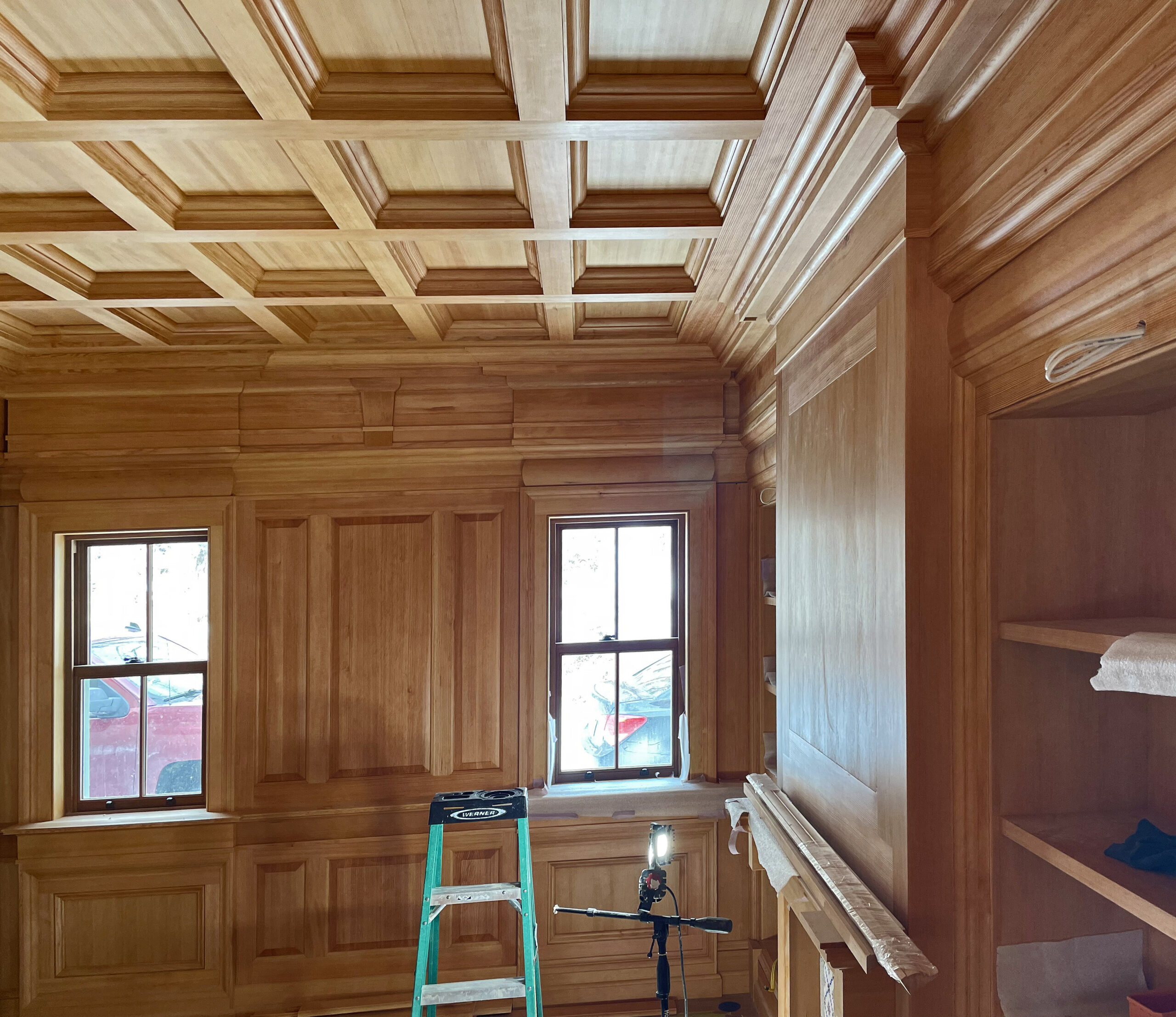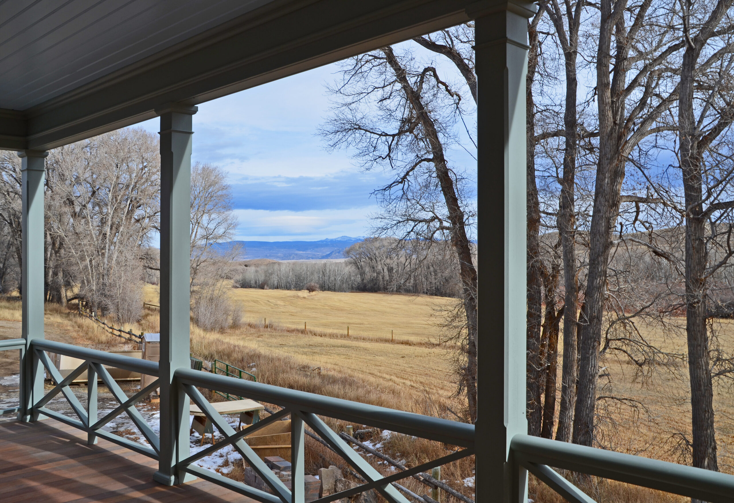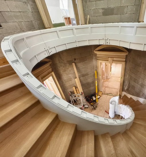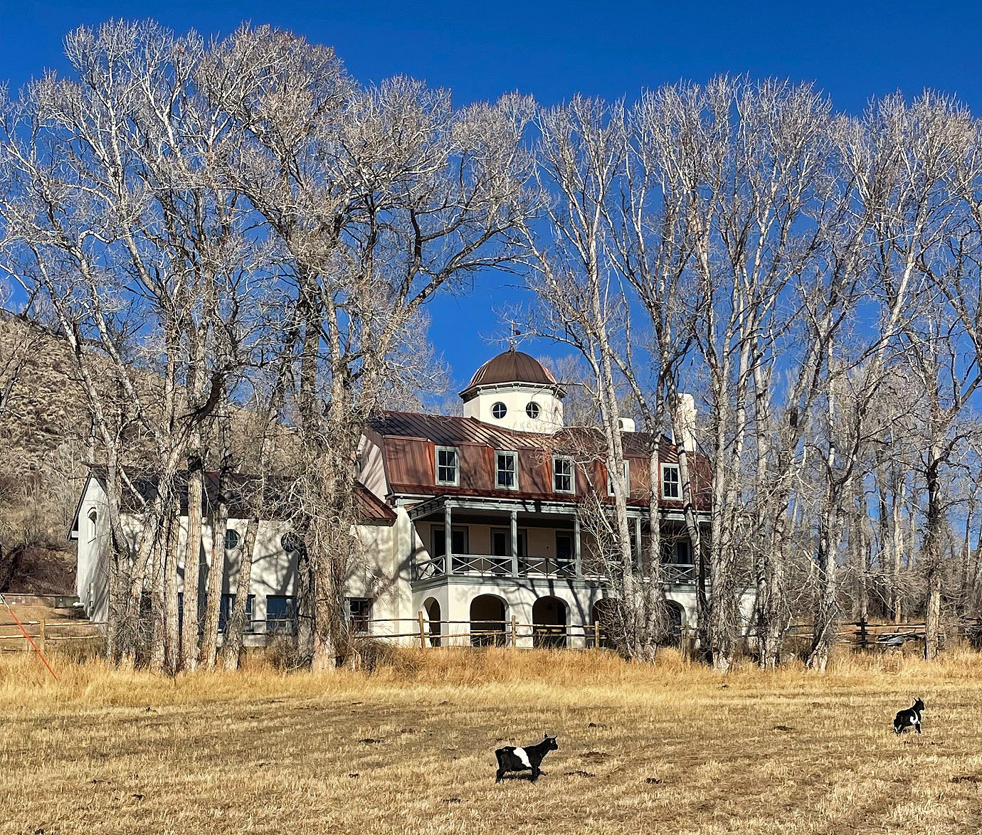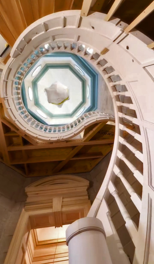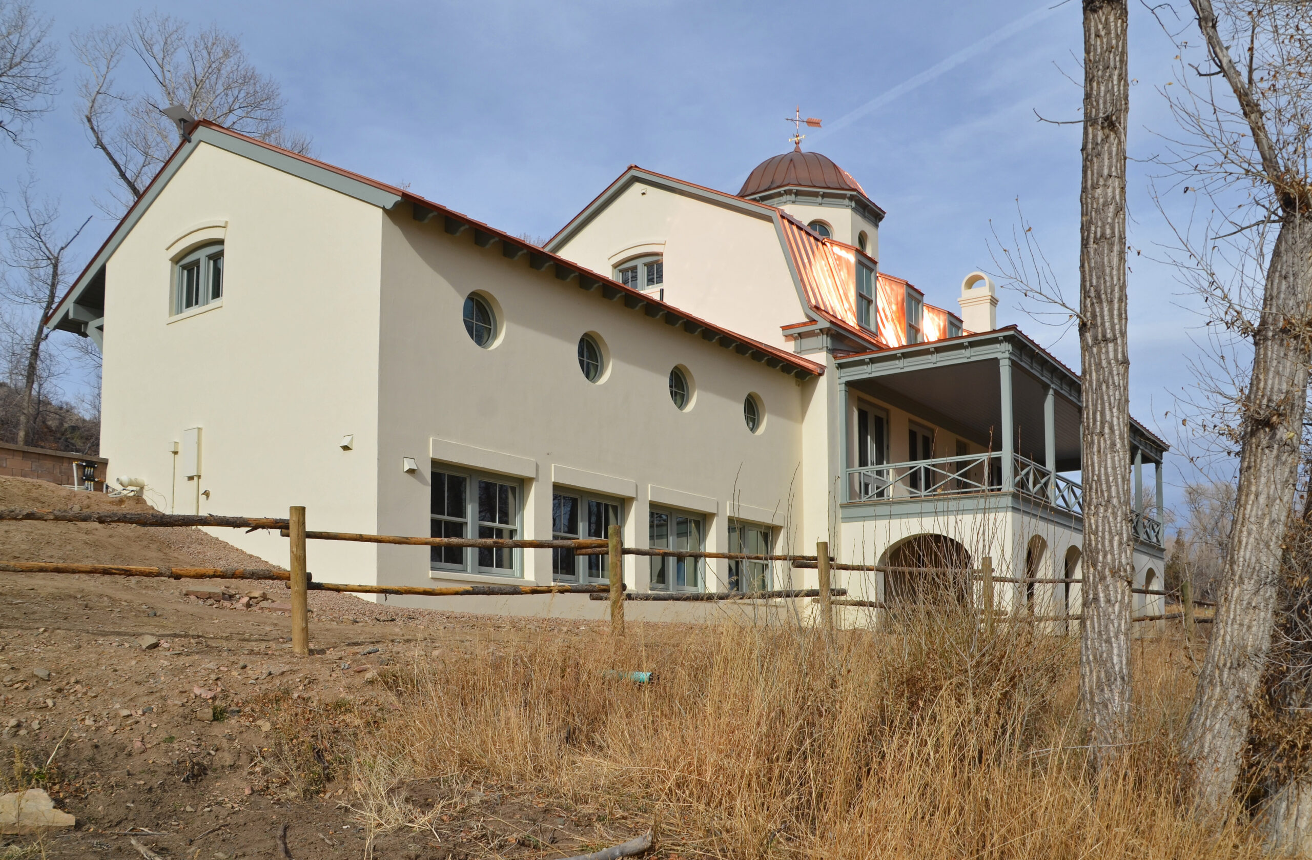 The solid-masonry house is extensively wood-paneled inside, with an extraordinary circular staircase ascending through the central cupola-hall. Andrew Gould and Tom Podhrazsky worked for months on the fine detailing of this house, much of which involves craftsmanship and historic styling that is otherwise unheard-of in contemporary Wyoming.