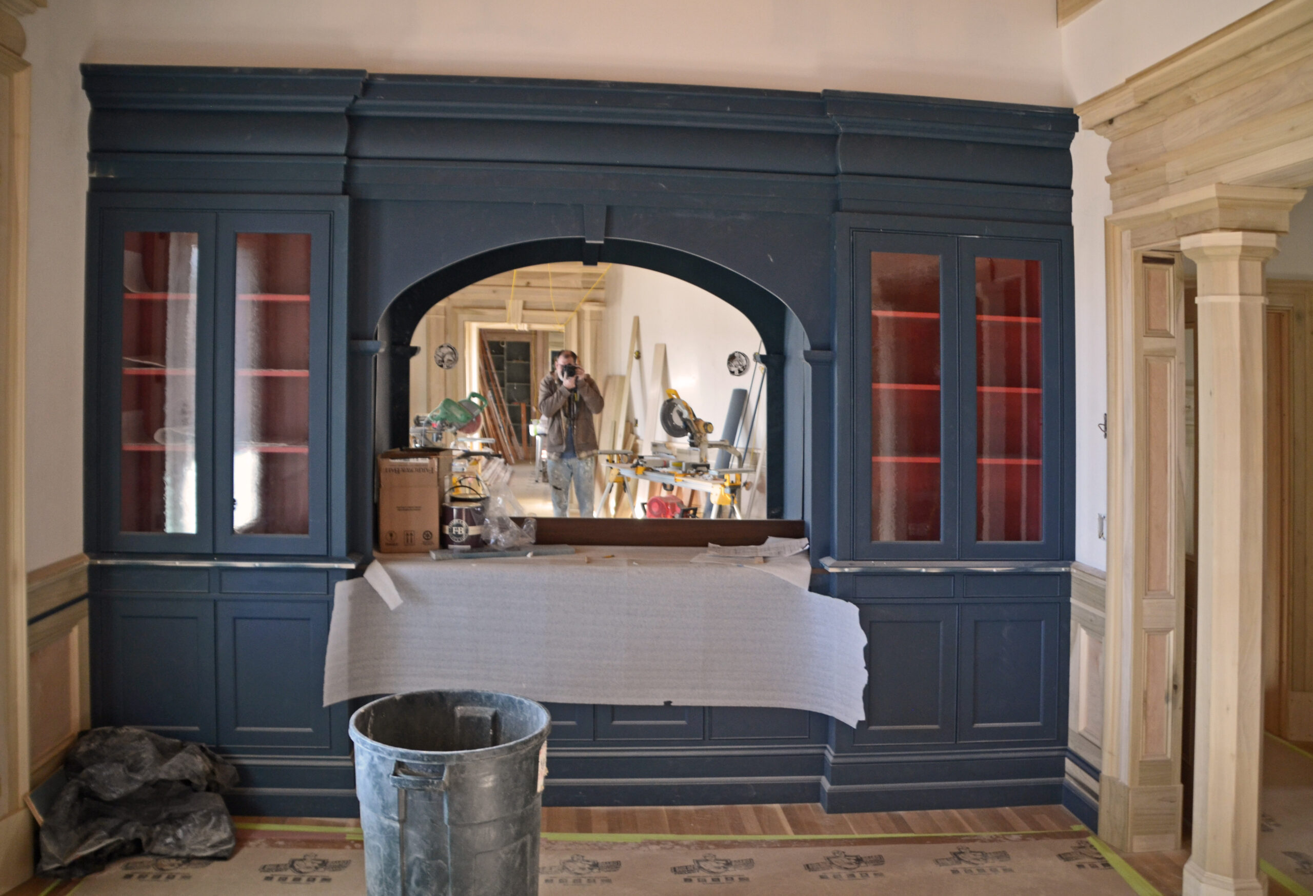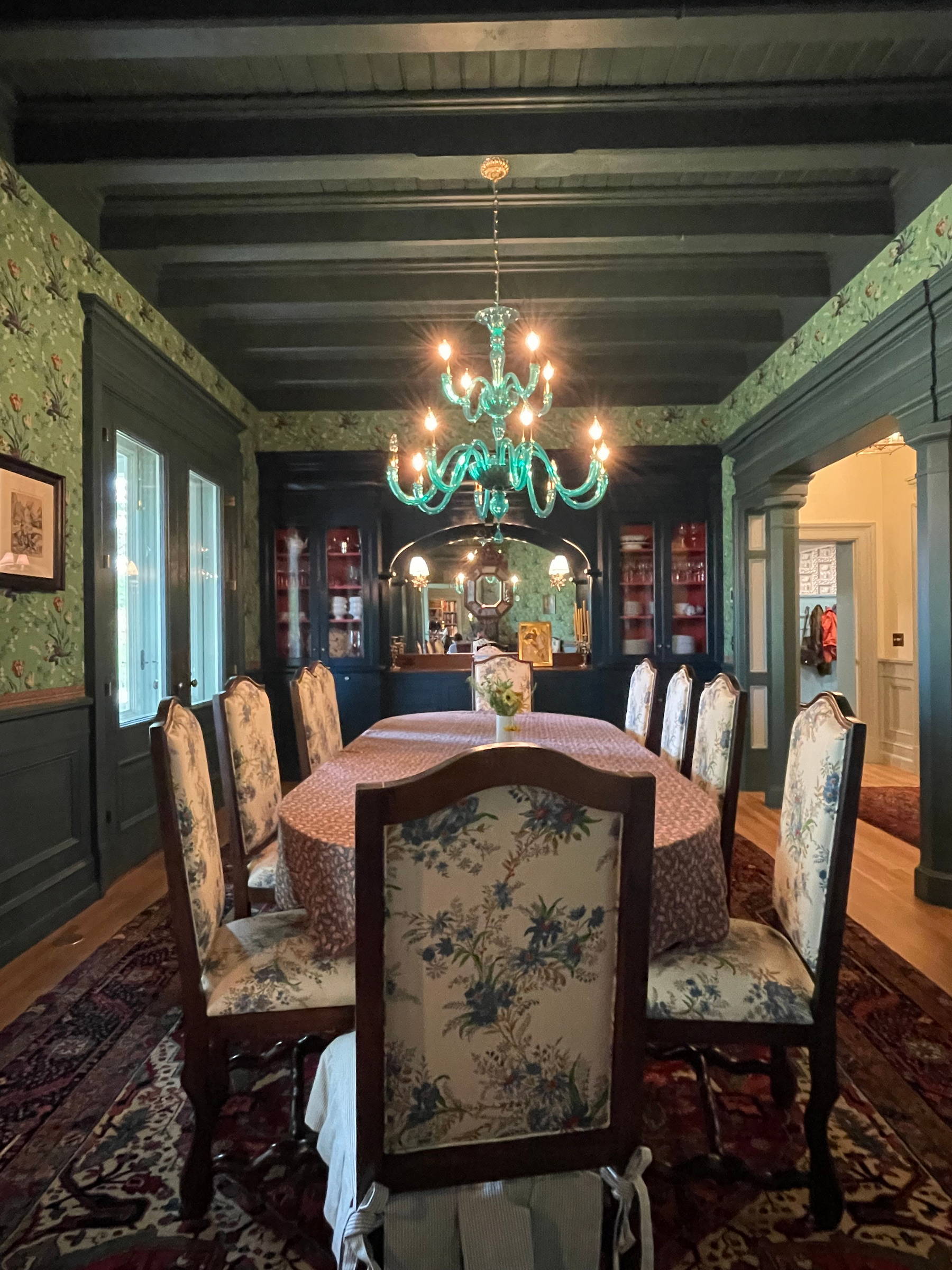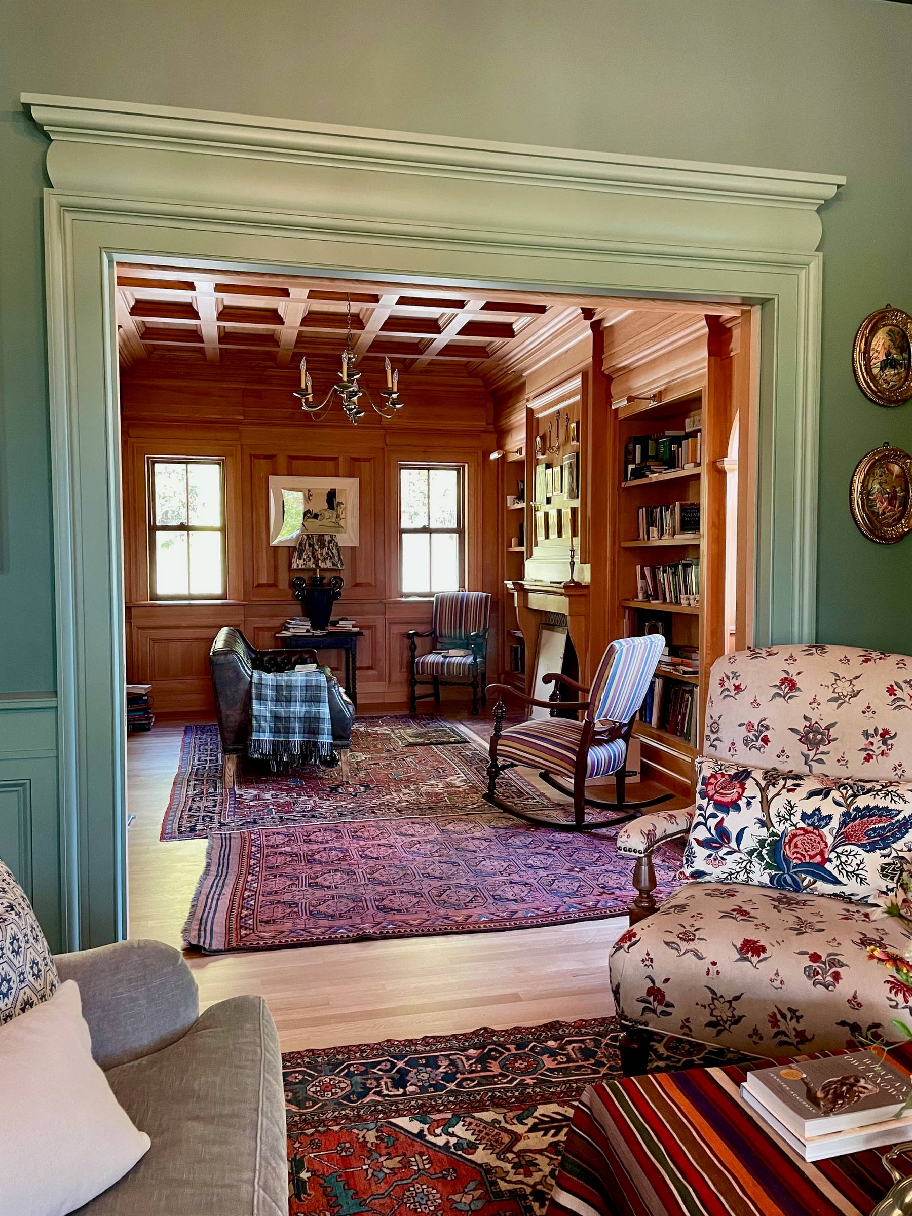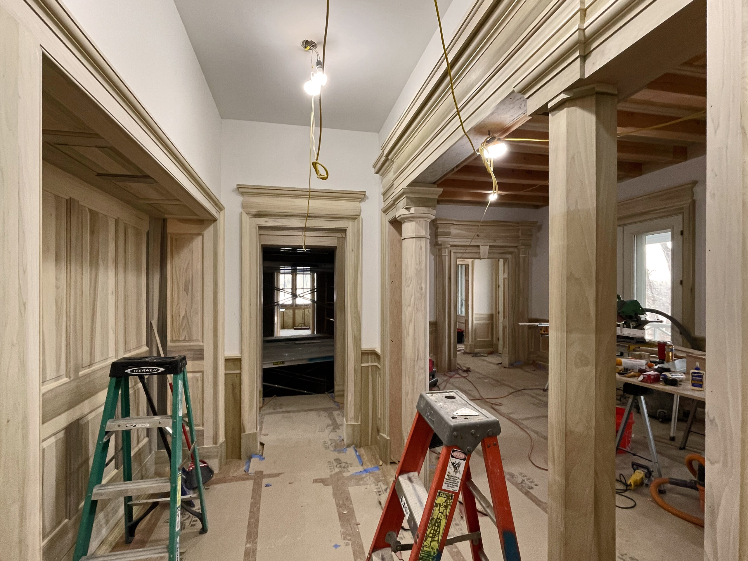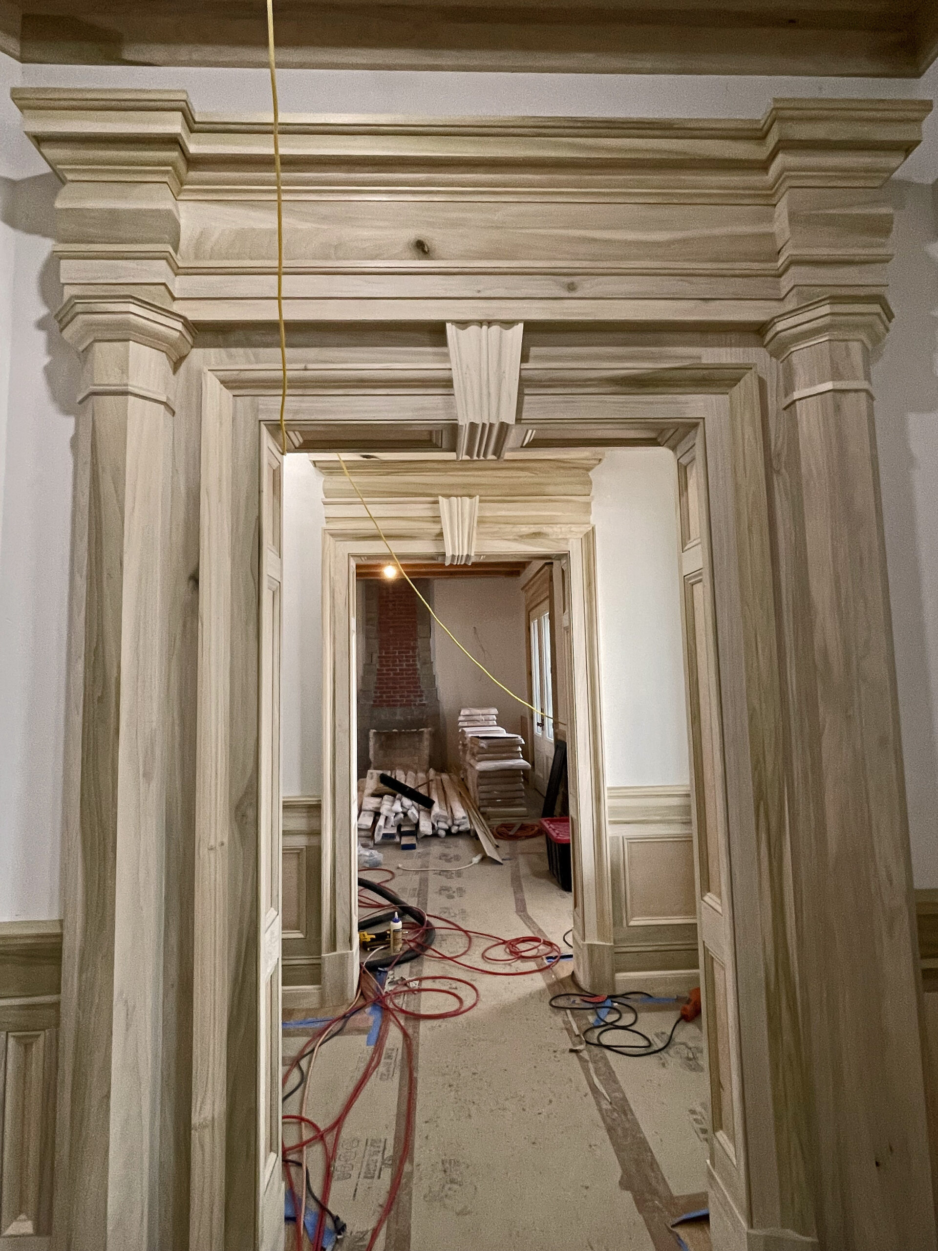 The solid-masonry house is extensively wood-paneled inside, with an extraordinary circular staircase ascending through the central cupola-hall. Andrew Gould and Tom Podhrazsky worked for months on the fine detailing of this house, much of which involves craftsmanship and historic styling that is otherwise unheard-of in contemporary Wyoming.