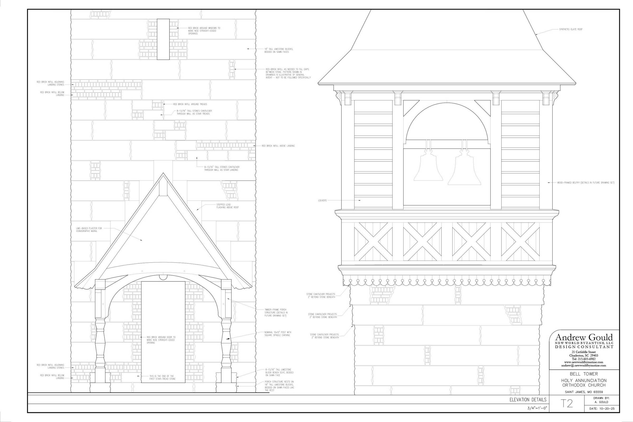 Annunciation Orthodox Church in Rolla, MO is a quickly-growing rural parish. The community bought farmland in 2023, which they subdivided to create a walkable Orthodox village. They already have a temporary church/parish hall under construction, which Andrew helped design. The centerpiece of the village will be a 70-foot-tall stone-and-timber bell tower standing at the crest of the hill. Andrew designed the tower to be built using locally available 18-inch-thick, rough limestone blocks. Ultimately, a large stone church will be built adjacent.