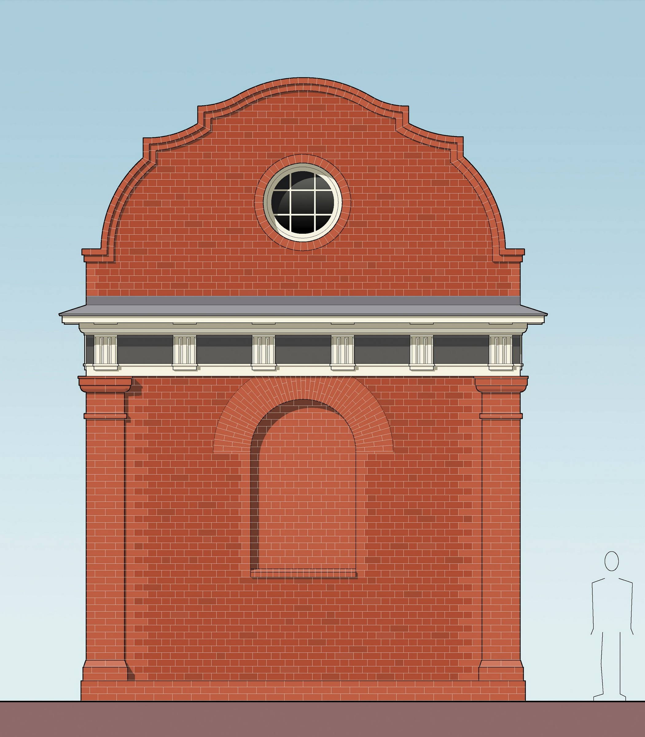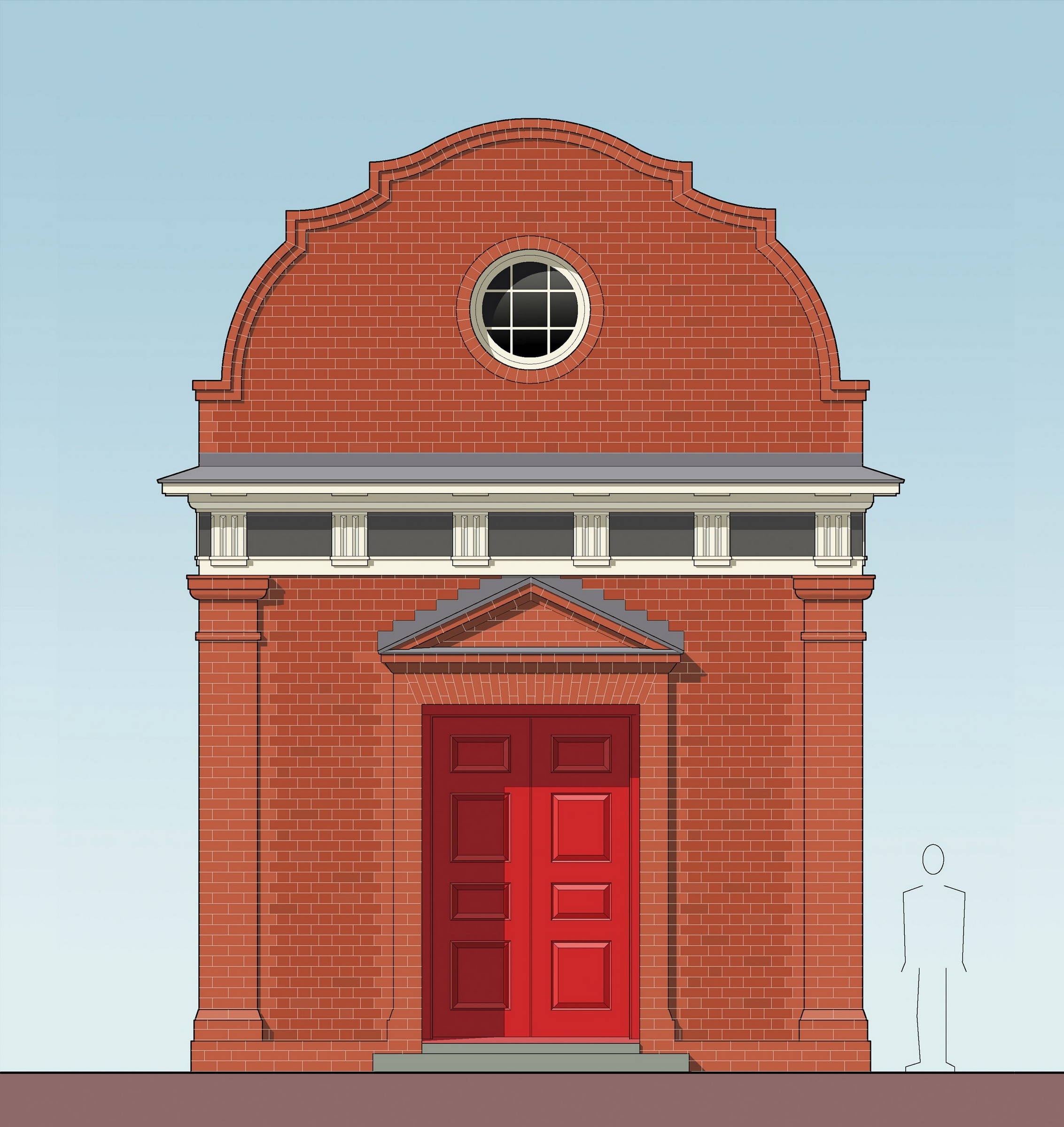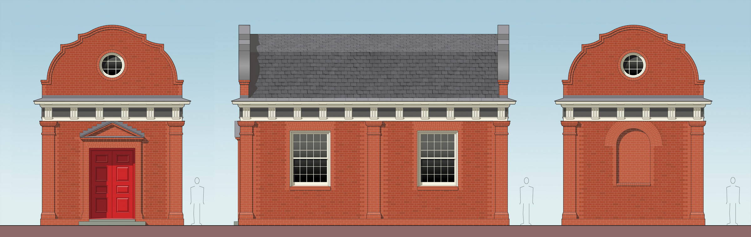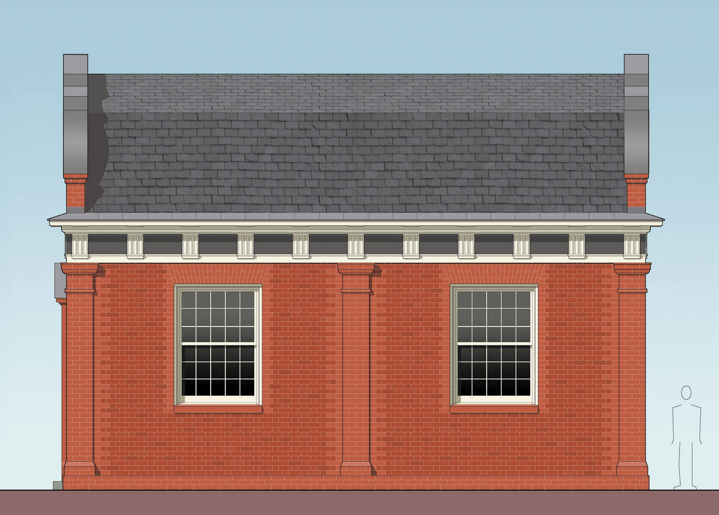 This small chapel was proposed as an addition to one of the historic plantation cemeteries in the South Carolina Lowcountry. Andrew styled the design after the several chapels-of-ease that survive in the region, dating from the early eighteenth century. Those historic structures are substantially larger, however, so this cemetery chapel is a conjectural design for what a 'miniature' chapel of the period might have looked like.